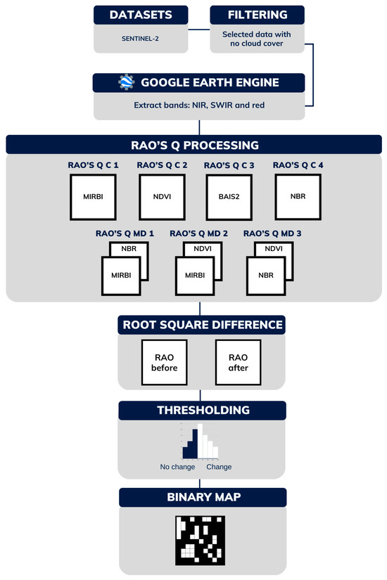 This research utilized Google Colab with GEE integration, employing Python 3.10 as the programming language in a stepwise way: (1) accessing the S2 satellite imagery repository on the GEE catalog; (2) extracting the NIR, SWIR, and red bands of the imagery; (3) applying the Rao’s Q classic approach using different spectral indices (MIRBI, NDVI, BAIS2, and NBR); (4) computing the Rao’s Q multidimensional using NBR, MIRBI, and NDVI; (5) calculating the square root of the post-image minus the pre-image for each study area; (6) determining the threshold; and (7) validating the results through statistical analysis for each study area, supported by information from reports and historical high-resolution images obtained from satellites and CEMS data (Figure 3).