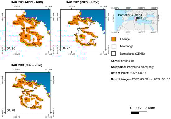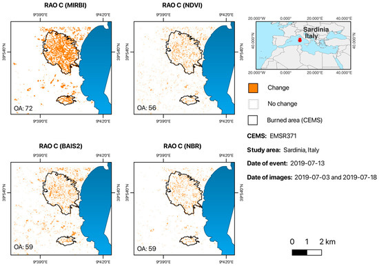Effectiveness of Rao’s Q MD in detecting burned areas in Sardinia: MIRBI + NBR achieved an OA of 93%, indicating superior detection capabilities. NBR + NDVI reached an OA of 73%, while MIRBI + NDVI had an OA of 91%, demonstrating the value of combining indices for more precise fire impact.