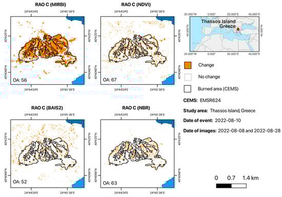 NDVI achieved the highest OA of 67%, indicating a relatively strong performance in identifying fire-impacted areas (Table 4). The NBR followed with an OA of 63%, demonstrating moderate reliability. The MIRBI recorded an OA of 56%, while the BAIS2 had the lowest OA of 52%. However, both the κ coefficients and the TSS values are very low. The highest κ value was determined by the NDVI (0.34, fair agreement), and the highest TSS value with the NBR (0.57, moderate accuracy). The same issue identified in the previous case study is observed regarding the identification of false negatives, resulting in low values of the Specificity metric (between 0.51 and 0.60) and moderately high values of the Quantity Disagreement (QD between 31% and 44%).