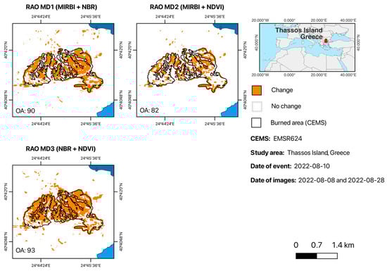 Effectiveness of Rao’s Q MD for detecting burned areas in Thassos: the MIRBI + NBR combination achieved an OA of 90%. The combinations of MIRBI + NDVI showed an OA of 82% and the NBR + NDVI an OA of 93%, indicating its superior accuracy in mapping burned areas.