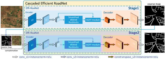In this paper, we adopt the encoder–decoder structure as the overall framework. The main idea is to design a simple network architecture that can learn the importance maps of features at multiple levels and accurately aggregate them from a spatial perspective. Conventional hierarchical encoder–decoder architectures directly utilize the convolutional layer to reduce the resolution through downsampling operations and increase the channel number by a factor of two at each stage [26,45]. Since the downsampling operation enlarges the receptive field by sacrificing the detailed information of roads, we propose to downsample the satellite image by a factor of 2 only twice, instead of four times. Apart from this, to address the issue of the shrinking receptive field caused by the reduced downsample operations, we replace the Convblocks with smoothed dilated convolution residual blocks. An attention-guided feature fusion sub-module is inserted as the bottleneck to fuse the multi-scale features to further strengthen the feature representation of roads. Finally, a simple decoder, which is made up of three convolutional layers, together with the aforementioned elements, form our encoder–decoder architecture, which we call Effi-RoadNet. Effi-RoadNet is cascaded twice to refine the extracted coarse road map and enhance the feature representation ability, as shown in Figure 2. In general, the proposed method can parallel patch-wise inference for large areas due to its low complexity. We demonstrate that the sequential application of a cascade of the proposed Effi-RoadNet is able to predict road locations efficiently and effectively.