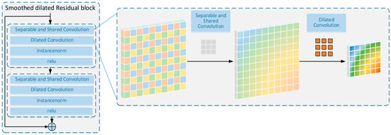 Given the narrowness, connectivity, complexity and extensive length of roads in remote sensing images, it is crucial to enhance the receptive field of the feature points in the central part of the network while preserving detailed information. Dilated convolution is a valuable technique to expand the receptive fields of feature points without reducing the resolution of feature maps. Furthermore, smoothed dilated convolution [33] addresses the gridding artifacts inherent in standard atrous convolutions by decomposing and smoothing the dilated convolution operations, thereby enhancing local consistency and reducing discontinuous receptive fields. Unlike conventional methods that rely on cascaded layers or hybrid dilation rates to mitigate gridding issues, this approach directly modifies the dilated convolution itself, achieving significant performance improvements with negligible additional parameters. As for road extraction tasks, smoothed dilated convolution is able to capture long-range dependencies in the image data while maintaining spatial resolution, enabling it to accurately delineate the road boundaries even in complex scenarios with various background textures and occlusions. The smoothing mechanism also helps in handling noise and irregularities in the remote sensing data, resulting in more reliable and detailed road extraction results compared to those of the standard atrous convolution. It should be noted that a separable and shared convolution is employed as the additional convolutional layer to integrate the neighboring information for each unit in the input feature maps. As shown in Figure 3, we stack the smoothed dilated convolution layer twice and add a shortcut connection to build a smoothed dilated residual block.