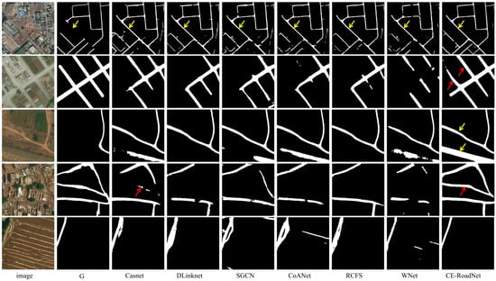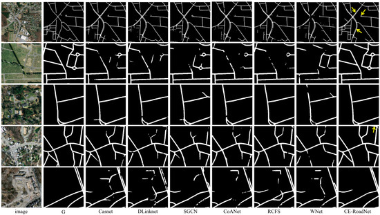 In Figure 5, for example, several roads are mislabeled in the ground truth road map where all methods predict part of the missing roads, among which CE-RoadNet achieves the best performance in preserving the continuity of the road topology (yellow arrows). Moreover, the predicted road masks by other methods suffer from varying degrees of fragmentation, while our CE-RoadNet exhibits better road connectivity (red arrows). CasNet encounters difficulties in accurately extracting roads in complex scenes with large areas of occlusion and interference; as shown in line 4, it cannot separate the road textures from those of the cluttered surroundings, leading to inaccurate segmentation results. In line 5, SGCN, CoANet and WNet face limitations in terms of recognizing the road-like features as roads. Among the seven models, the extraction results of WNet are the worst, since it is only a simple extension of UNet, which has a limited feature extraction ability. The degree of fragmentation of the extraction results and the number of extraction failures are the largest among all images, which is also consistent with the results of the quantitative analysis in Table 1 and Table 2.