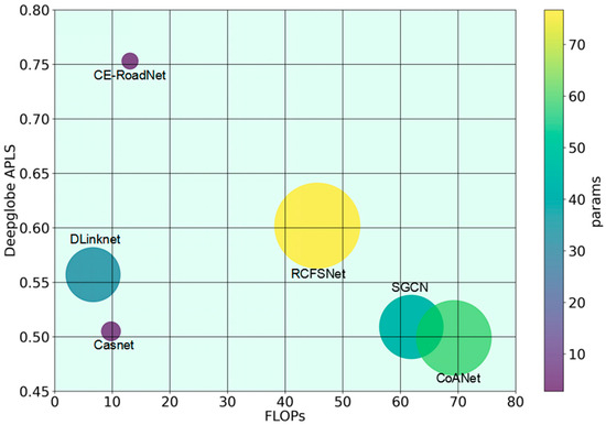 The FLOPs, params and the inference latency of the models are also compared in Table 3 and Figure 8. The latency is measured on one NVIDIA Tesla V100-PCIE GPU (with 32 GB GPU memory) and Intel(R) Core(TM) i7-7700CPU (Intel, Santa Clara, CA, USA), with a fixed batch size of four samples. As shown, the sophisticated design of SGCN, CoANet and RCFS leads to increased computational complexity and memory usage, particularly when processing high-resolution images. CE-RoadNet endeavors to achieve the optimal balance between computational complexity and performance. It has the least parameters and only spends one-third of the floating-point operations than the most complex model, indicating that it is a far less complex model than most approaches. The diminished complexity of the model presented in this paper enhances its suitability for wide-range remote sensing image road detection scenarios.