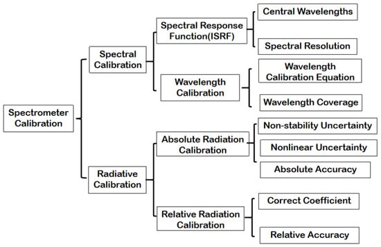 Laboratory calibration of the optical performance of SWIR spectrometers typically involves two stages: spectral and radiation calibrations. Spectral calibration determines the spectral characteristics of systems, serving the prerequisite for radiation calibration and forming the basis for improving the reliability of spectrometer measurements [14]. Radiometric calibration evaluates the radiation response ability of an imaging spectrometer system in different bands [15], quantitatively obtains the radiation information of various ground objects, inversely derives the radiation characteristics of ground objects, and inverts the atmospheric CH4 concentration. The classification of SWIR spectrometer calibration methods is shown in Figure 2.