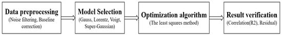 First, the data measured by the spectrometer were preprocessed; this included the use of the Savitzky–Golay filtering algorithm and a baseline correction to filter out high-frequency noise and remove background drift, respectively. Then, the Gauss, Lorentz, Voigt and super-Gaussian models were selected to fit the data, and the least-squares method was used for iteration to obtain the fitting parameters. Finally, the most suitable fitting model was selected according to the fitting parameters such as the correlation coefficient and residual. Different models were analyzed, as shown below.