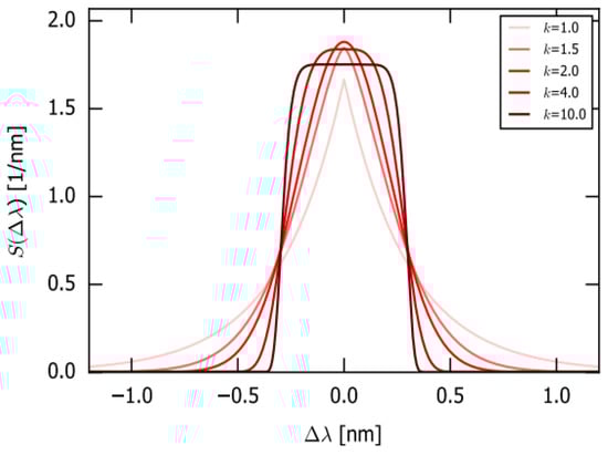 For k > 2, the S function curve becomes a “flat top”. When k → ∞, the function converges to a box with a width of 2ω. When k < 2, S becomes sharper at the top and has long tails on both sides. The maximum FWHM of the S function is