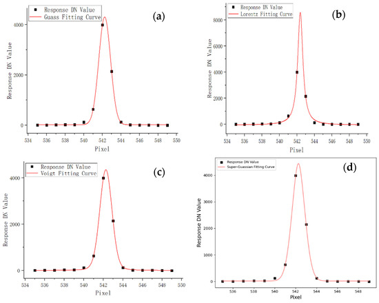 A monochromatic light source was used to measure the SRF parameters of the spectrometer. Data were collected from multiple pixels before and after a single peak. Notably, the scatter plot of the results was similar to a Gaussian distribution. Consequently, the Gaussian, Lorentz, Voigt, and super-Gaussian function models were selected to fit the spectral response data [17], and the fitting results were compared. The flow chart of the fitting process is shown in Figure 3: