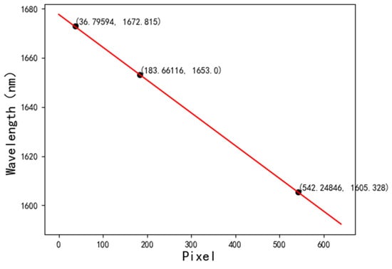The regression coefficient of the described fitting line is R2 = 0.99999, indicating a one-to-one correspondence between the detector pixel and the wavelength. The spectral range of the spectrometer, calculated using the calibration equation, is 1592.4–1677.6 nm; this meets the design requirements of the SWIR spectrometer band.
