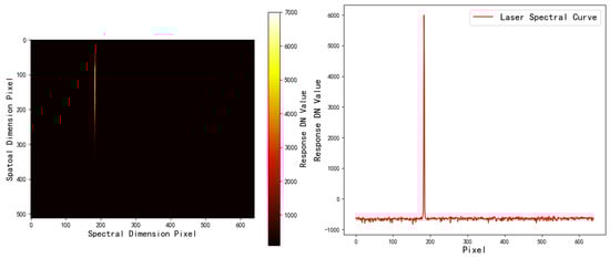 A monochromatic laser was used to verify the spectral calibration results, and the characteristic spectral line value of the laser was analyzed accordingly. The measurement results are shown in Figure 8. The wavelength of the laser was calculated according to the calibration Equation (11) and compared with its real wavelength value. The results, shown in Table 4, indicate a maximum calibration deviation of 0.022, demonstrating a small deviation and high calibration accuracy when using the standard spectral line method and thus meeting the calibration requirement (deviation < 0.05 nm). Additionally, the system’s center wavelength for each band exhibited high linearity.