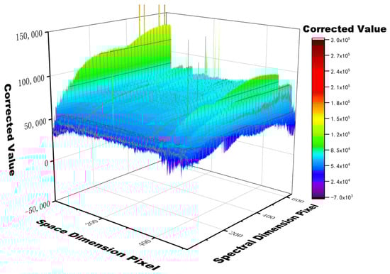 where subscripts I and j represent the row and column numbers of the area array detector, respectively. DNij is the measured DN response value in column j of line I of the spectrometer, DNc is the output value of the corrected spectrometer pixel, and aij and bij are the nonuniformity correction coefficients of the pixel. The uniformity correction coefficients aij and bij of each pixel are determined using the least-squares method by changing the incident radiation intensity. The following 3D image was corrected using the SWIR spectrometer for the integrating sphere flat field measurement [30]. Figure 11 shows that after the relative radiation calibration of the SWIR spectrometer, the measured flat field image becomes smoother and more uniform, confirming the effectiveness of the radiation calibration.
