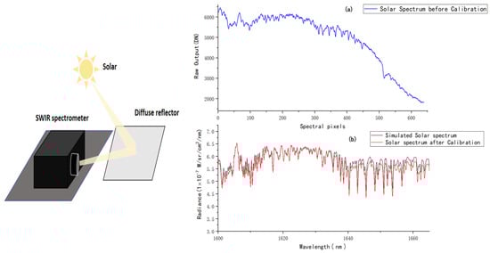 The results showed that before spectrometer calibration, the measured data information lacked calibration, with the abscissa representing the detector pixel value and the ordinate indicating the DN value. Consequently, the data cannot provide effective solar spectral information and cannot be used. After calibration, the horizontal coordinate of the solar spectrum measured using the spectrometer was converted to wavelength (nm), and the vertical coordinate was converted to the ground-measured radiance (W/cm2·nm·sr). The image shows that the spectrometer calibration changes the noise and stray light interference caused by the non-uniformity of the detector and improves the response decline at 1650–1680 nm owing to the quantum efficiency of the detector. Thus, the completed solar spectral data can be obtained [32]. Subsequently, the SCIATRAN radiative transfer model was used to simulate the ground solar spectrum and measured solar spectrum for verification. Notably, the error between the two was less than 5%, confirming the effectiveness of the calibration of the SWIR spectrometer and thus providing a solid foundation for subsequent trace gas inversion.