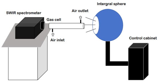 The CH4 standard gas experiment was conducted in a laboratory at standard atmospheric pressure and 20 °C. As shown in Figure 13, an integrating sphere was used as the stable light source. By adjusting the output power of the integrating sphere, the light intensity was controlled at 4.5 × 10−7 W/sr/cm2/nm. The purpose was to simulate the scattered light intensity reflected by the solar radiation after it was irradiated on the ground, thus preparing the subsequent measurement of the CH4 concentration in the atmosphere. Simultaneously, a cylindrical sealed tube was used as the gas cell. The upper and lower gas cell were equipped with inlets and outlets, respectively. The gas cell was 50 cm long with a radius of 4.5 cm. During the measurement, the light emitted by the integrating sphere light source passed through the gas cell and was measured using the SWIR spectrometer [33].