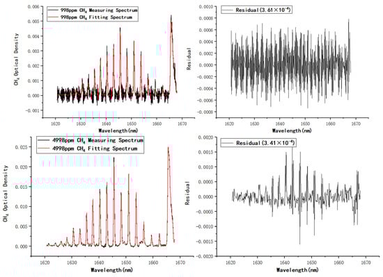 Fitting results of CH4 standard gas experiment and fitting residual curves of 998 ppm (up) and 4998 ppm (down).