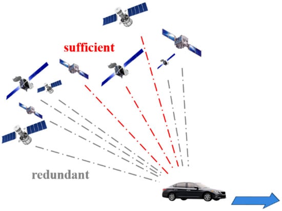 The traditional satellite selection algorithm can determine the optimal satellite combination through calculating the Geometric Dilution of Precisions (GDOP) of all the satellite combinations [9]. The optimal satellite combination has the smallest GDOP. However, since a GDOP solution involves complex matrix multiplication and inversion operations, the computational load of calculating the GDOP for all combinations at a single epoch can skyrocket as the number of visible satellites increases, greatly reducing the efficiency of satellite selection algorithm. Refs. [10,11] have attempted to reduce the computational complexity of GDOP through the GDOP’s closed-form formulations to improve the efficiency of the satellite selection algorithm. Likewise, refs. [12,13] proposed a satellite selection algorithm in which the optimal satellite combination can be obtained through maximizing the volume of the polyhedron comprised by the unit vectors from the user to satellites. However, these satellite selection algorithms do not significantly reduce the computational costs or enhance the efficiency of satellite selection because the algorithms must still traverse all satellite combinations in the selection process.
