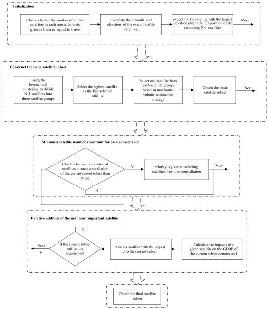 To ensure their accuracy and reliability, a minimum number of satellites should be set for each constellation. The suggested minimum number is three [34]. Therefore, before the initialization of satellite selection process, it is necessary to check whether the number of visible satellites in each constellation is not less than the minimum number. If a constellation has fewer than three visible satellites, satellites of the constellation will be ruled out in the subsequent satellite selection. Then, the whole satellite selection is subject to the minimum satellite number constraint. If the number of satellites in any constellation of the current satellite subset is less than three, and the number of visible satellites in the constellation is more than three, selecting priority is given to the constellation when adding the satellite with the maximum J-value to the current subset.