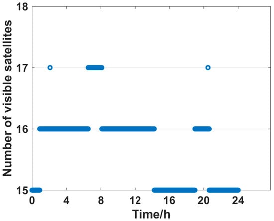 In this section, simulation experiments based on simulated data and real-world data are carried out to verify the effectiveness of the proposed algorithm and assess its performance by comparing it to other algorithms. In the simulation experiments, a 24 h satellite simulation generated the BDS data and an Intel Core i5-7400CPU @ 3.00 GHz with 16 GB RAM computer ran the simulations and calculations. The receiver was placed in Xi’an (34.158°N, 108.909°E). The satellite selection was performed every 10 s (totally 8640 epochs). The number of visible satellites ranges from 15 to 17 at each positioning epoch, as shown in Figure 6.