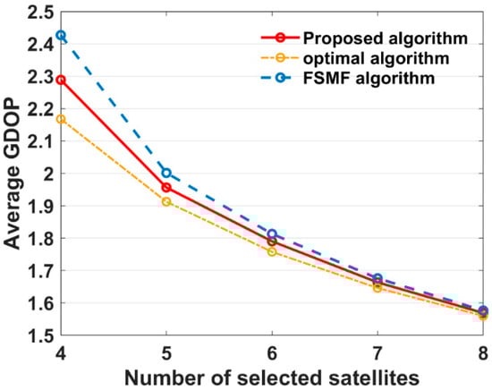 In Figure 7, Figure 8, Figure 9, Figure 10 and Figure 11, the number of selected satellites ranges from 4 to 8 and the GDOP obtained by the three algorithms generally decreases as more satellites are added, with the optimal algorithm achieving the best GDOP performance. However, as illustrated in Figure 12, with the increase in the satellite subset, the proposed algorithm’s average GDOP performance ranging from 2.288 to 1.569 is better than the FSMF algorithm’s GDOP average of 2.427 to 1.577. Notably, when the satellite subset is 4 and 5, the GDOP of the FSMF algorithm unstably fluctuates between 16:00 and 20:00 whereas the proposed algorithm does not show this instability.