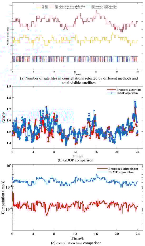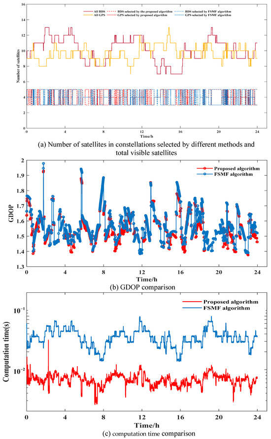 In this section, to further demonstrate the effectiveness of the algorithm, experiments were conducted using BDS/GPS satellite data collected by three different stations (ABMF, URUM and DUMG of International GNSS Service (IGS) on 1 November 2024. The receiver positions are (14.59°N, 61.00°W), (43.81°N, 87.60°E) and (66.67°S, 140.00°E), respectively. The experiments lasted for 24 h with GPS/BDS integrated system positioning every 30 s (2880 epochs). GDOP is the main indicator for evaluating positioning accuracy and can evaluate the results of algorithms. Therefore, we compared the GDOP results and computation time of the proposed method, FSMF method, and optimal method. To reduce the impact of atmospheric delays caused by low elevation angles, we set the cut-off elevation angle to 5° [35].