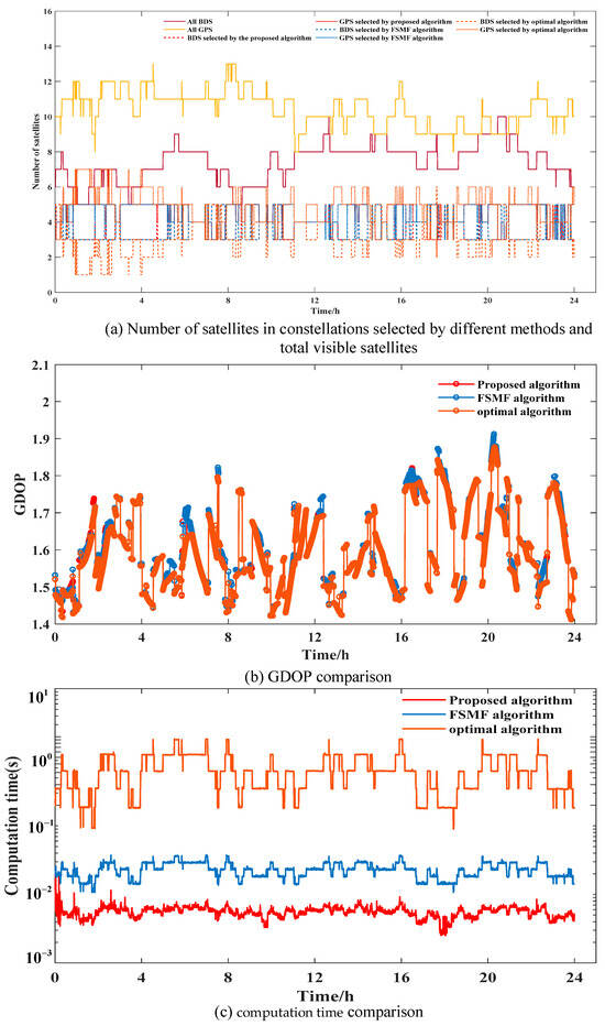 In this section, the satellite selections were carried out through the proposed algorithm with respect to three different GDOP requirements of 2, 3, 4 to evaluate the ability to obtain the minimal subset. According to these different GDOP requirements, we also use the FSMF algorithm to make the satellite selections. The computation time spent on satellite selection has also been simultaneously recorded.