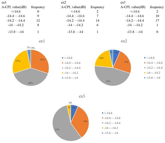 Figure 3 shows the A-ASPL value (dB) frequency distribution table and the corresponding pie chart of the three experiments (ex1, ex2, ex3). The A-ASPL values of each experiment are divided into the same five intervals, as shown in Figure 3. In ex1, the −17.9∼−17.4 dB interval has the highest frequency at 40%, and the interval <−18.4 dB has the lowest frequency at 0%. Ex2 also reaches the highest frequency (47%) in the interval −17.9∼−17.4 dB, and the frequency of interval <−18.4 dB is 17%. Ex3 has the same frequency of 47% as ex2 in the interval −17.9∼−17.4 dB, while its frequency increases from 17% to 40% in the interval <−18.4 dB compared to ex2.