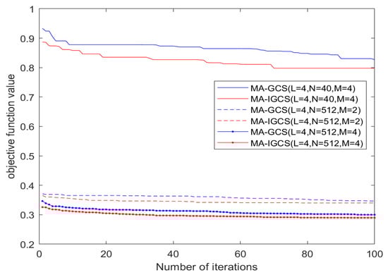 Figure 5 illustrates how the objective function value varies in each iteration under the three different conditions. It can be seen from Figure 5 that during each iteration with same parameters, the objective function value of the MA-IGCS is consistently lower than that of the MA-GCS. After the last iteration, compared to the MA-GCS, the MA-IGCS achieves a significant reduction in the objective function of the ODCSs. That shows that the MA-IGCS has more powerful search capabilities. Additionally, it can be inferred from Figure 5 that there is a significant decrease in the objective function values of the ODCSs when code length N increases from 40 to 512. Furthermore, when the number of optional phases is increased from 2 to 4, the objective function values of the ODCSs drop considerably as well.