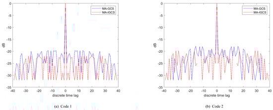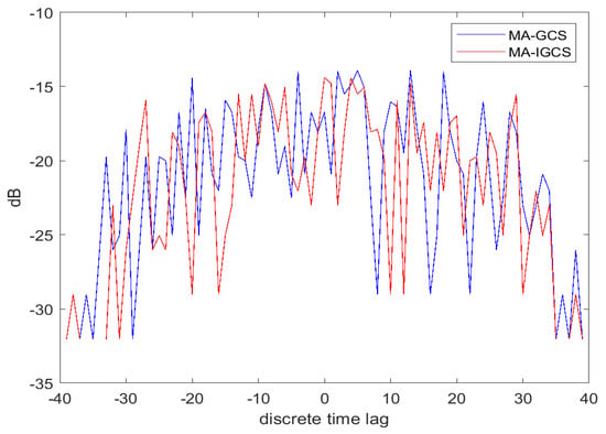 To demonstrate the performance of the MA-IGCS and MA-GCS more intuitively and not take up too much space, the autocorrelation and cross-correlation of the optimal four-phase code obtained by the two algorithms with , are depicted in Figure 6 and Figure 7, respectively. From Figure 6 and Figure 7, it can be inferred that the MA-IGCS algorithm achieves a lower autocorrelation sidelobe peak level than the MA-GCS algorithm, and the cross-correlation peak level is comparable.