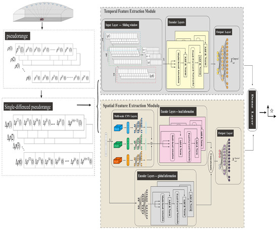 - We developed a temporal feature extraction module based on the Transformer-based encoder structure and self-attention mechanism. This module employs a sliding window to segment historical data into temporal steps, enabling the parallel processing of multiple subspaces and learning the correlations of single-differenced pseudoranges across consecutive time intervals.