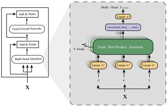 Multi-head attention (Figure 3) involves learning multiple sets of distinct weight matrices for the same input vector X, which are then used to compute different Q, K, and V representations for each attention head. Each head independently calculates the , and the outputs from all heads are concatenated and projected to generate the final output matrix. This approach enhances information diversity by capturing different subspaces across various positions. The multi-head attention function is defined as follows: