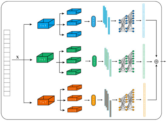 For the selection of convolutional kernels in the multi-scale CNN, our goal is to learn spatial local features. Based on commonly used kernel sizes (1, 3, 5, and 7) in spatial feature learning, and after considering the feature extraction requirements, we prioritized the use of 1 × 1, 3 × 3, and 7 × 7 as the kernel sizes, with a stride of 1. The 1-sized kernel can capture fine local features, such as subtle changes in the data. The 7-sized kernel provides a larger receptive field to extract spatial distribution features of the data over a broader range. The 3-sized kernel strikes a balance between the continuity of local features and a specific receptive field range, helping to bridge the gap between small and large scales and ensuring the model can effectively process and integrate features from different scales within local regions. Combining these three kernel sizes allows the model to perform feature extraction on 1D sequence data at multiple scales, providing more comprehensive and richer feature information for subsequent analysis and processing, thereby enhancing the model’s performance.