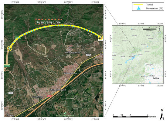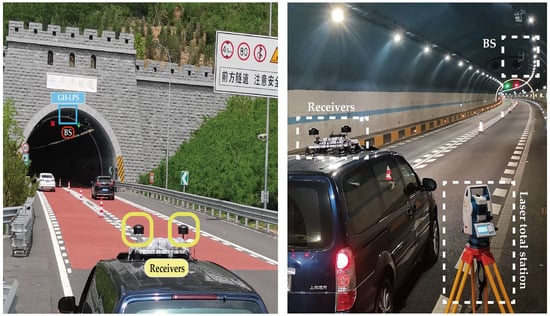 We conducted experiments by deploying 34 pseudolite base stations (BSs) in a 4.6 km long highway tunnel to evaluate the performance of the proposed model, as shown in Figure 5. Due to the curvature of the tunnel, the average spacing between adjacent base stations was 144 m, with a maximum gap of 203 m. These base stations were installed at the center of the tunnel ceiling [14], as shown in Figure 6. Meanwhile, receivers were installed on the test vehicle (Figure 6), and six sets of path data were collected at various times, resulting in 70,424 positioning signals. The precise locations of the base stations were obtained using a laser total station.
