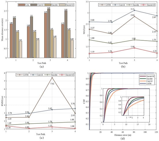Comparison of the errors of the four localization models in the four test paths. (a) Comparison of Mean Distance Error, (b) comparison of MAE, (c) comparison of RMSE, (d) CDF comparison for distance error.