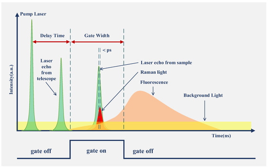 52]. When the pulsed laser illuminates the target, the Raman signal is generated at the same time as the laser reaches the target surface and quickly disappears when the laser stops, which is on the ps scale. Raman spectra are susceptible to interference from solar background light in in situ lunar surface measurements. Depending on the properties of the sample, there is also fluorescence interference during the excitation process, which varies widely in generation time and lifetime, generally being on the order of picoseconds with lifetimes on the order of nanoseconds to milliseconds.