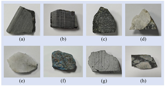 To facilitate the fixation of the mineral and rock samples in the sample stage, the samples were cut into similar-sized blocks with long sides of about 50–60 mm. The samples were prepared with one or more facets, which exhibited natural surfaces that had not been treated in any way. The surface state of the sample has an impact on the detection of the remote Raman signal. An uneven surface increases the difficulty of focusing the excitation light and the dispersion of the test results. In order to simulate the working condition of the LRS during the in situ lunar detection, the detection points are selected in the natural surface of the sample without any treatment.