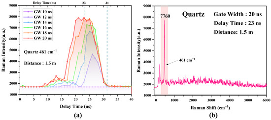 Figure 4b shows the quartz Raman spectrum measured under the condition of a gating width of 20 ns and a delay time of 23 ns.
