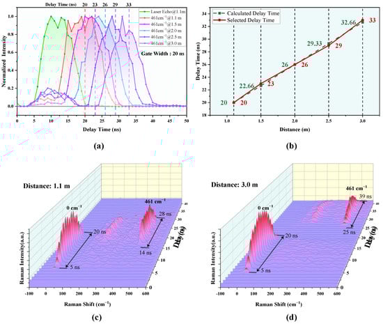 Figure 5a, which clearly shows the relationship between the relative intensities of the Raman spectra with the delay time at different detection distances. In addition, to facilitate the analysis and discussion, we systematically organize and present the detection distances with the corresponding effective delay times as well as the optimal delay times in