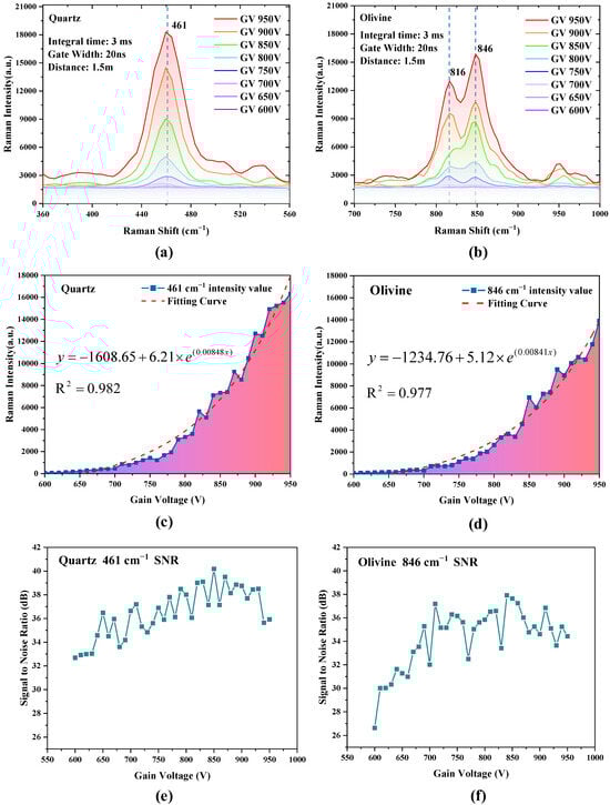 Figure 6e,f show the variation patterns of the Raman SNRs for quartz and peridot under the corresponding test conditions. Specifically, the SNR of quartz reaches the lowest value of 32.7 dB at 600 V and rises to the highest value of 37.9 dB at 840 V, while that of olivine records the lowest value of 26.6 dB at 600 V and reaches the highest value of 40.2 dB at 850 V. Although the SNR of the two minerals is not very different and fluctuates overall, both show a tendency to increase and then decrease with the gain voltage. The trend of the SNR of the two minerals is not significant.
