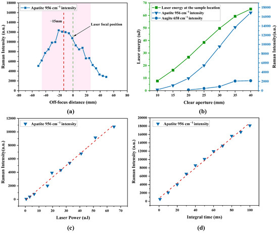 Figure 7c,d show the linear relationship between the Raman signal intensity of apatite and the laser energy and integration time, respectively, further verifying the good linear correlation between the Raman signal intensity and these parameters.