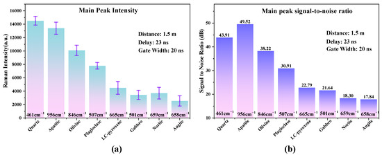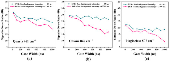 Figure 9a,b, at a gating width of 20 ns and a solar background illumination of 85 lux, the Raman SNRs of the Raman peaks of quartz (461 cm