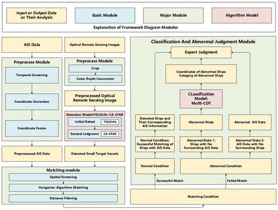 Against this backdrop, ensuring the effective identification and anomaly monitoring of small vessels has become increasingly important. Existing research primarily focuses on vessel anomaly detection based on AIS (Automatic Identification System) trajectory data [1,2]. However, monitoring methods that rely on AIS signals faces significant challenges. Malicious actors may deactivate or tamper with AIS data to evade surveillance and monitoring [3,4]. To counter this, some studies have incorporated shore-based radar trajectories to supplement AIS tracking [5,6,7,8]. Yet, shore-based radar is limited to nearshore areas and struggles to cover vast and complex high seas area. To address the blind spots inherent in AIS monitoring, remote sensing technologies have emerged as a powerful supplementary tool. Remote sensing imagery offers all-weather, all-encompassing monitoring of the sea surface, particularly in adverse weather conditions or when AIS data are unavailable. In such instances, remote sensing images can still provide effective vessel information. Consequently, some existing studies have sought to integrate remote sensing imagery and AIS data to enable vessel monitoring across a broader range of maritime areas [9,10,11,12,13,14], thus offering a more comprehensive information base for detecting illicit activities and supporting maritime safety management. However, the majority of vessel recognition methods in current research rely on successful matches between AIS data and remote sensing imagery, often neglecting the need for further analysis of anomalies arising from mismatched or failed matches. This gap presents a significant challenge for the comprehensive and reliable monitoring of maritime activities.
