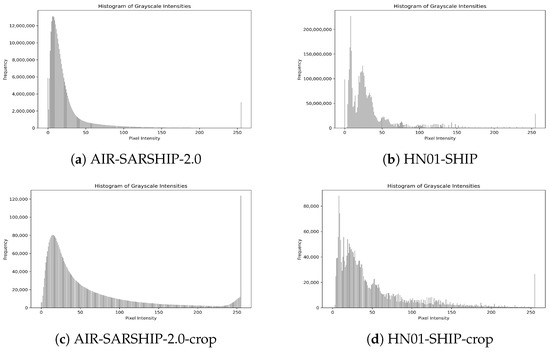 Therefore, the CFAR method is not directly applicable to optical remote sensing imagery. So, we extracted grayscale histograms from SAR images and optical remote sensing images to analyze their statistical properties. In Figure 3a,b, the histograms extracted from the SAR image small target ship detection dataset (AIR-SARSHIP-2.0 [55]) and our own optical remote sensing small target ship detection dataset (HN01-SHIP [29]) are presented, respectively. Figure 3c,d display the histograms extracted from the AIR-SARSHIP-2.0 image and the HN01-SHIP image after slice processing. To better analyze the similarities or differences between the histograms, we employed the Bhattacharyya distance, as shown in Equation (8), and the Chi-squared test, as shown in Equation (9), for quantitative comparison.