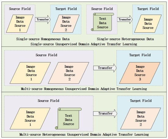 The existing unsupervised domain-adaptive transfer learning research mainly focuses on the homogeneous or heterogeneous transfer of a single-source domain, and even if a multi-source domain is involved, most of them are limited to the transfer of multi-source homogeneous data. In [61], the fusion use of heterogeneous data in transform detection is mentioned, but it refers to optical data with different resolutions. In [62], although unsupervised domain adaptation of multi-source heterogeneous data is also mentioned, it refers to the difference in the feature dimension of the source domain. The concept of multi-source heterogeneous data mentioned in this paper is different from the former.