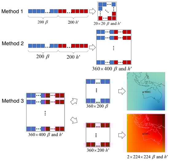 The ionospheric parameters (h′ and β) are directly used as the input of the neural network model and don’t need to be renormalized. In this study, three methods were used to process the input data to be used in the deep learning network. These methods were designed for different spatial and dimensional representations. The first method specifically used data from a single propagation path, namely a 1 × 400 one-dimensional matrix. The number 400 corresponds to the 200 pairs of h′ and β used for each segment. This matrix was then reshaped into a 20 × 20 two-dimensional matrix to fulfill the input requirements of neural network (see Figure 2). The second method utilized data from the 360 azimuth angles, namely a 360 × 400 two-dimensional matrix. This approach preserved the full set of propagation paths along different azimuth angles. The third method mapped the data from the 360 paths to their corresponding geographic latitude and longitude coordinates, namely the h′ and β at different latitudes and longitudes near the transmitter. This map was subsequently converted into an image, which was directly used as an input for the neural network.