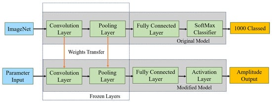 In this work, we utilized the pre-trained weights for the initial layers of VGG16, GoogLeNet, and ResNet, which were imported from the TensorFlow library in Python. The latter layers of the networks were modified based on the LWPC dataset. For example, using Method 2, the input data—organized as a four-dimensional tensor—was directly fed into the frozen convolutional and pooling layers. The last three layers of the network, including the fully connected layer, the linear activation layer, and the output layer, were replaced to provide the output format required for the LWPC dataset. Specifically, the neural elements in the fully connected layer were adjusted to output the data relevant to the LWPC task, instead of the original 1000-class classification used in the pre-trained models. The flowchart of the transfer learning model are shown in Figure 4.