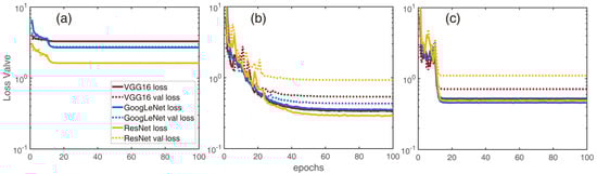 During the training process of deep learning, the loss typically decreases as the model gradually minimizes the discrepancy between its predictions and the target values. The initial loss may be high, and, as the training progresses, the optimization algorithm updates the model’s parameters, improves the predictions, and the loss decreases. This decrease is largely nonlinear, with a rapid decrease followed by plateaus or fluctuations, particularly when the model encounters more complex patterns in the data. Monitoring the loss on both the training and validation (denoted as ‘val loss’ hereafter) sets is crucial. This helps identify the overfitting issue, namely the training loss continues to decrease while the validation loss starts to increase [51]. The loss curves obtained with the three methods and three networks are presented in Figure 5.