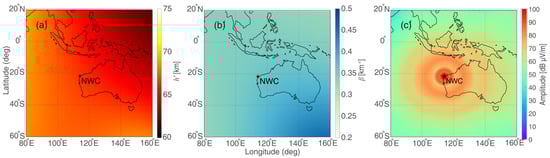 The h and β values used for the calculation of VLF amplitude along a single propagation path, corresponding to the azimuth angle of 0° near NWC. The figures on the left refer to h′ and β in the area surrounding NWC, and the one on the right refers to the amplitude distribution.