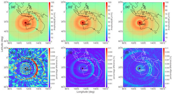 Upper row: the VLF amplitude obtained using (a) input method 1; (c) input method 2; and (e) input method 3. Bottom row: (b,d,f) the difference between the upper row and the results shown in Figure 6c.
