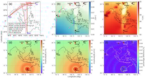 (a) The great circle paths between NWC, JJI, and VTX transmitters and the receivers in Suizhou, Wuhan, and Leshan, China. (b) β (c) h′ derived from the VLF measurements in Suizhou, Wuhan, and Leshan. The signal amplitude near NWC calculated using (d) LWPC and (e) the GoogLeNet model (input method 2). (f) The difference between LWPC results and the results obtained using the GoogLeNet model.
