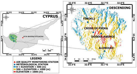 For validation purposes, air quality data were sourced from the Ayia Marina Xyliatou station, which was chosen for its strategic location approximately 20 km east of the Paphos forest (35.04N; 33.06E) and at an elevation of 535 m above sea level (Figure 1). This station was chosen since it measures continuously and updates the data in real-time of the Particulate Matter in the air, with a diameter of 10 (PM10) and 2.5 (PM2.5) micrometres or less, which were needed for this study.