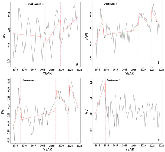 Detection of abrupt changes with the BFAST decomposition algorithm for AVI (a), SAVI (b), EVI (c), and VV polarisation (d). The red line indicates the breaks in the trend component. Labelled breakpoints correspond to dust events, while other detected changes may result from different environmental factors.